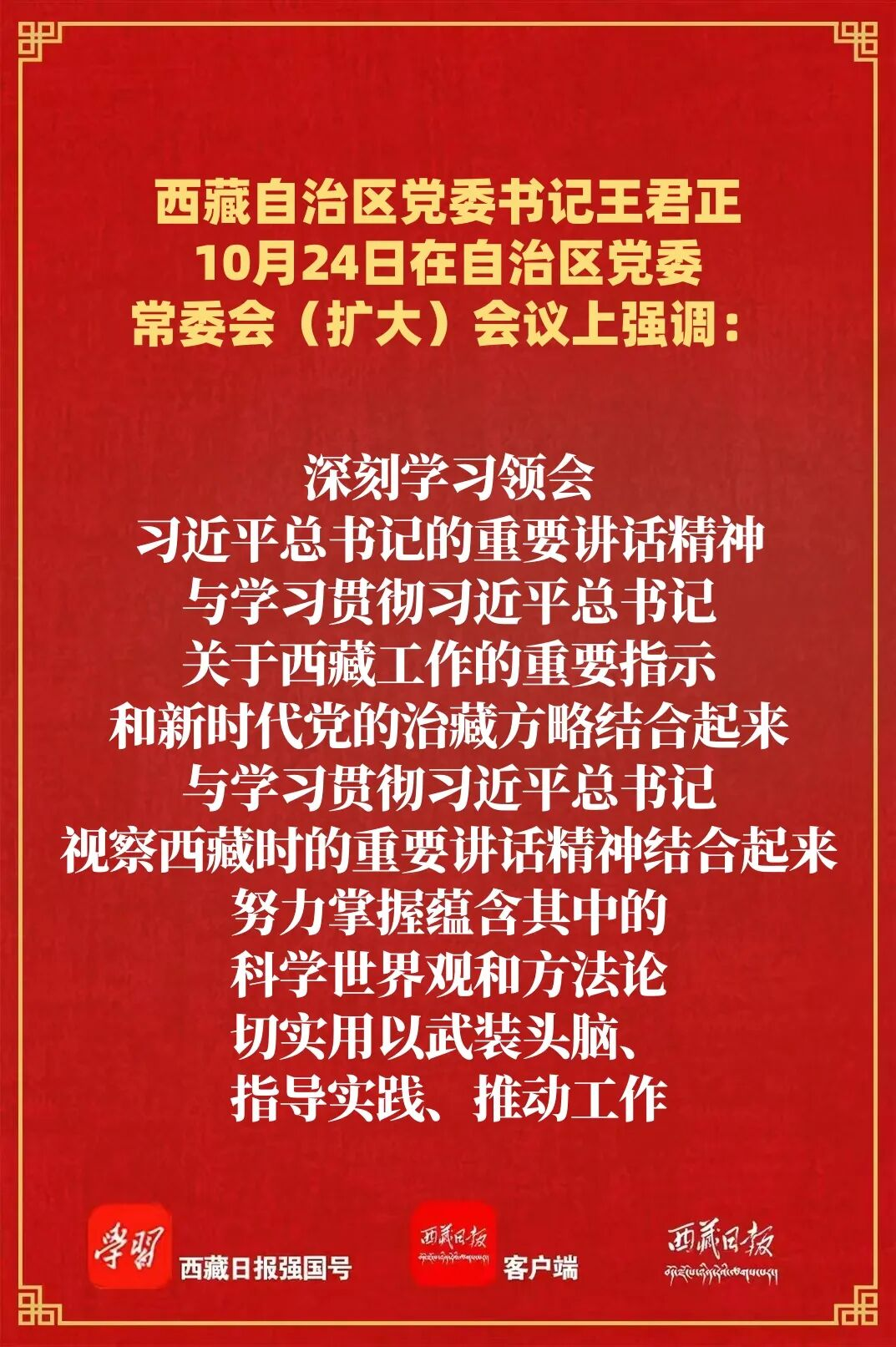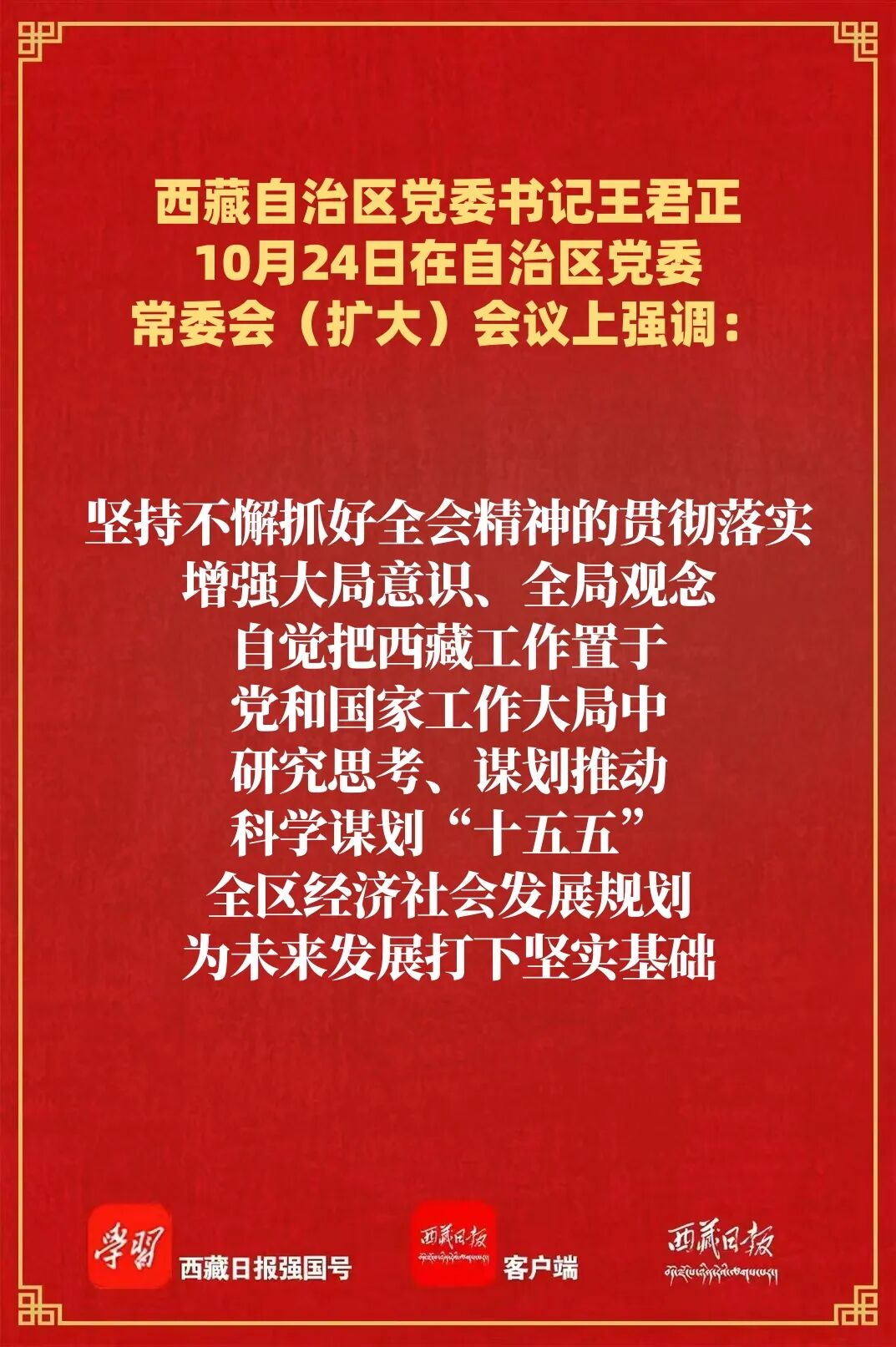 10月24日,自治区党委书记王君正主持召开自治区党委常委会(扩大)会议,传达学习党的二十届四中全会精神。他强调,要认真学习贯彻习近平总书记重要讲话精神,加快推动社会主义现代化新西藏建设。
