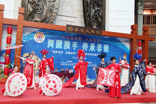 活动现场精彩纷呈,龙岩剪纸的精巧灵动、客家木偶戏的活灵活现,与边坝锅庄的热情奔放、格萨尔说唱的古朴厚重轮番登台,赢得现场观众阵阵掌声。