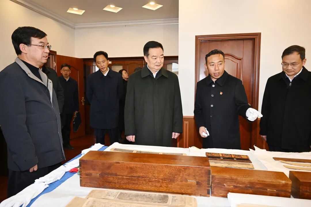 3月18日,自治区党委书记王君正宣讲全国两会精神并调研城市建设、文物保护、财政等工作,检查指导全区树立和践行正确政绩观学习教育开展情况。这是王君正在自治区文物局,认真听取第四次全国文物普查、贝叶经等古籍文献保护利用、学术研究、文物安全监管平台运行等情况介绍,察看考古发掘成果展示。记者 李洲 摄